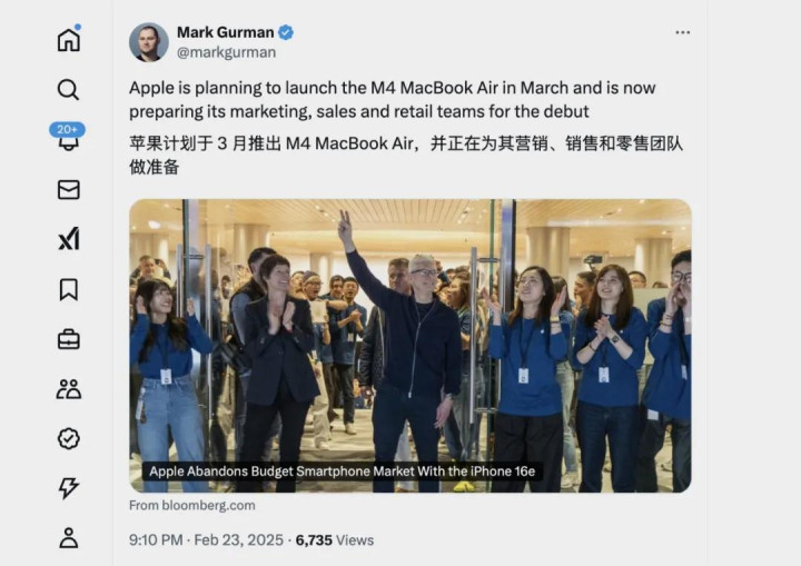 据彭博社记者Mark Gurman爆料,搭载M4芯片的新款MacBook Air计划在今年3月正式发布。目前全球零售店正加速清空M2/M3机型库存,苹果的营销、销售和零售团队也已经开始为这款新品的发布做准备。