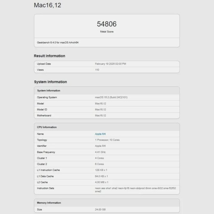 近日网上已经流出了疑似M4 MacBook Air的跑分数据。据数据显示,该设备代号为“Mac16,12”,运行macOS 15.2系统,配备十核M4芯片和24GB统一内存,主频达到4.41GHz,这也是目前记录到的M4芯片的最高频率。